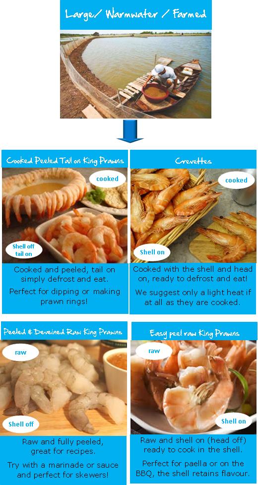 Available in both warm and coldwater, cooked and raw there is usually a shell on or a shell off version. This is down to personal preference. On the coldwater prawns you may like to shell them yourself as the shell retains more of the flavour but most people prefer the ease of just defrosting and adding to a salad or jacket potato.